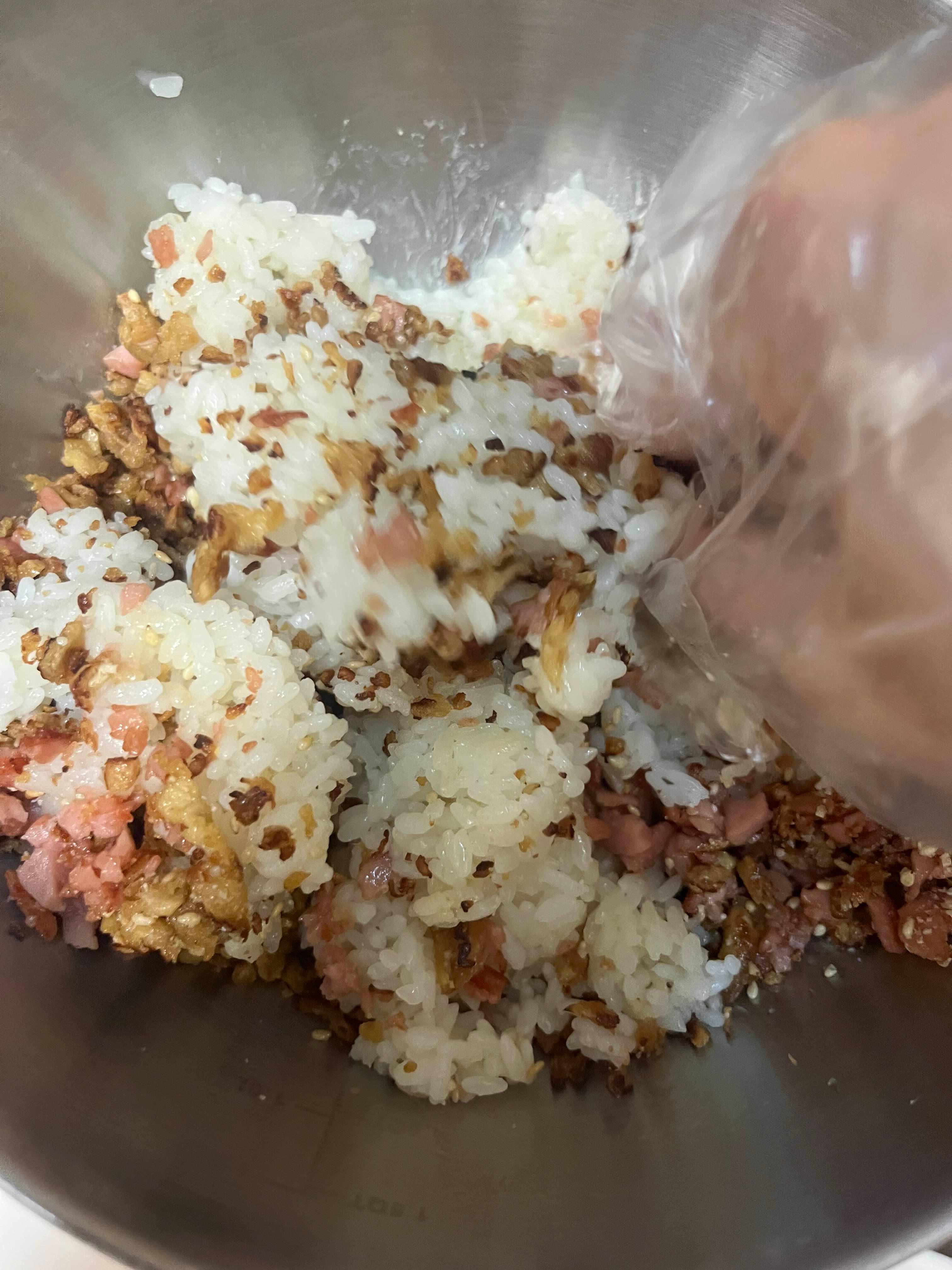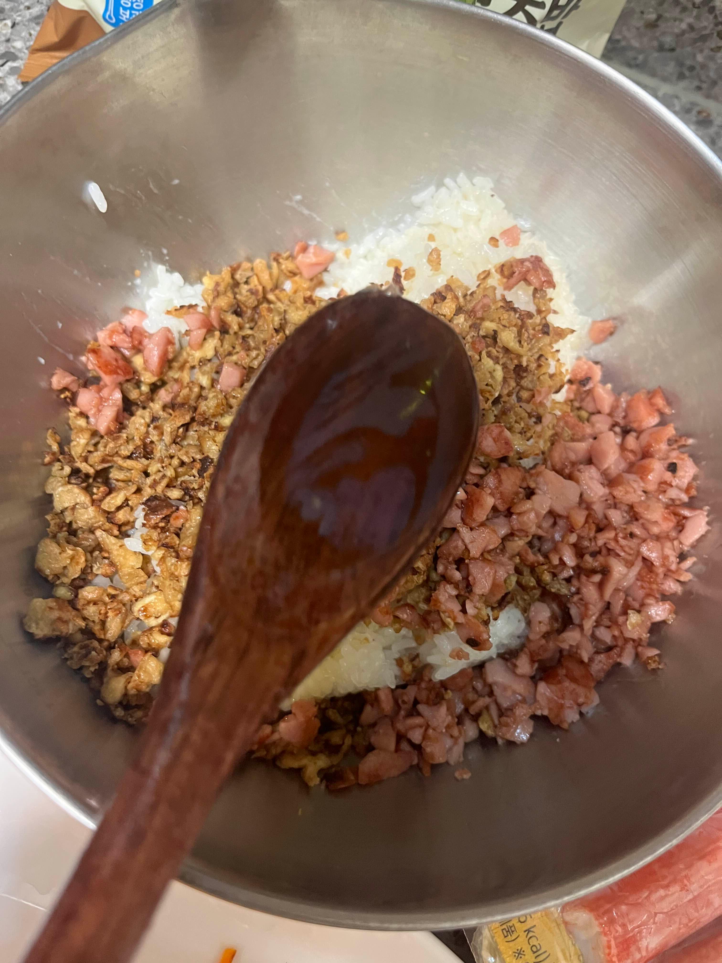 볶은 유부와 소시지를 밥에 다 넣어주세요