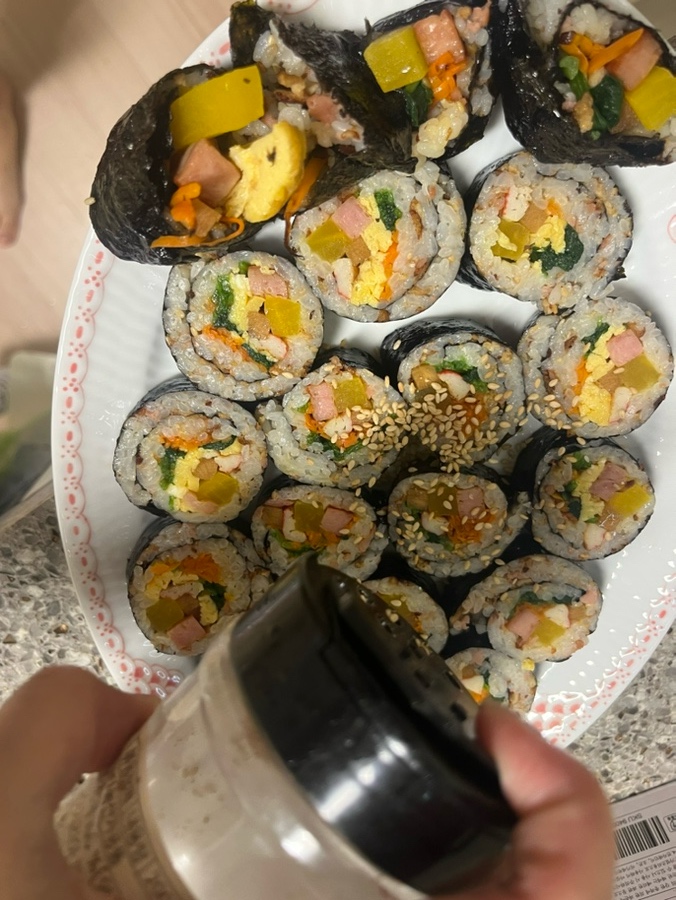 완성된 김밥 위에 통깨를 솔솔 뿌려주세요