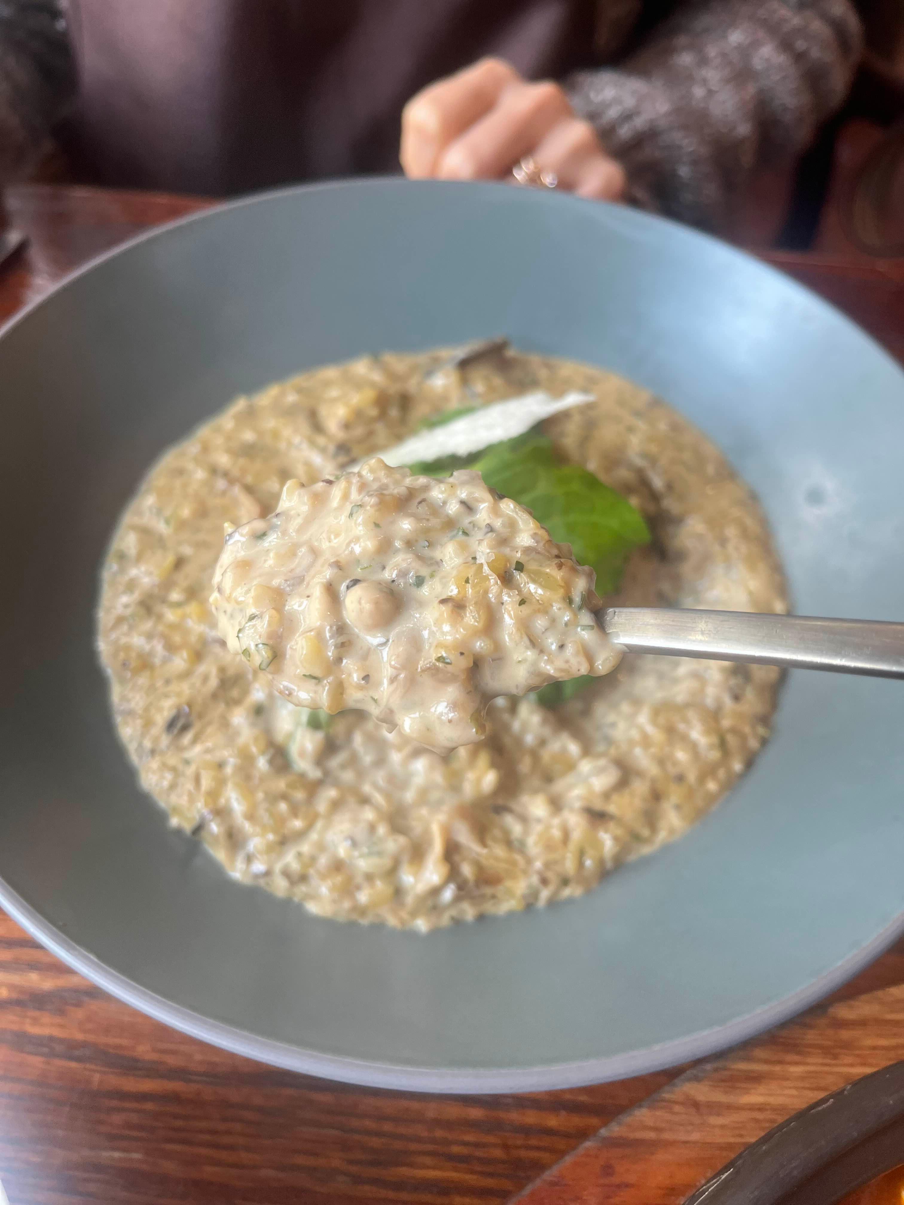 뽀모도로 버섯리조또에 루꼴라가 올라가 있는데